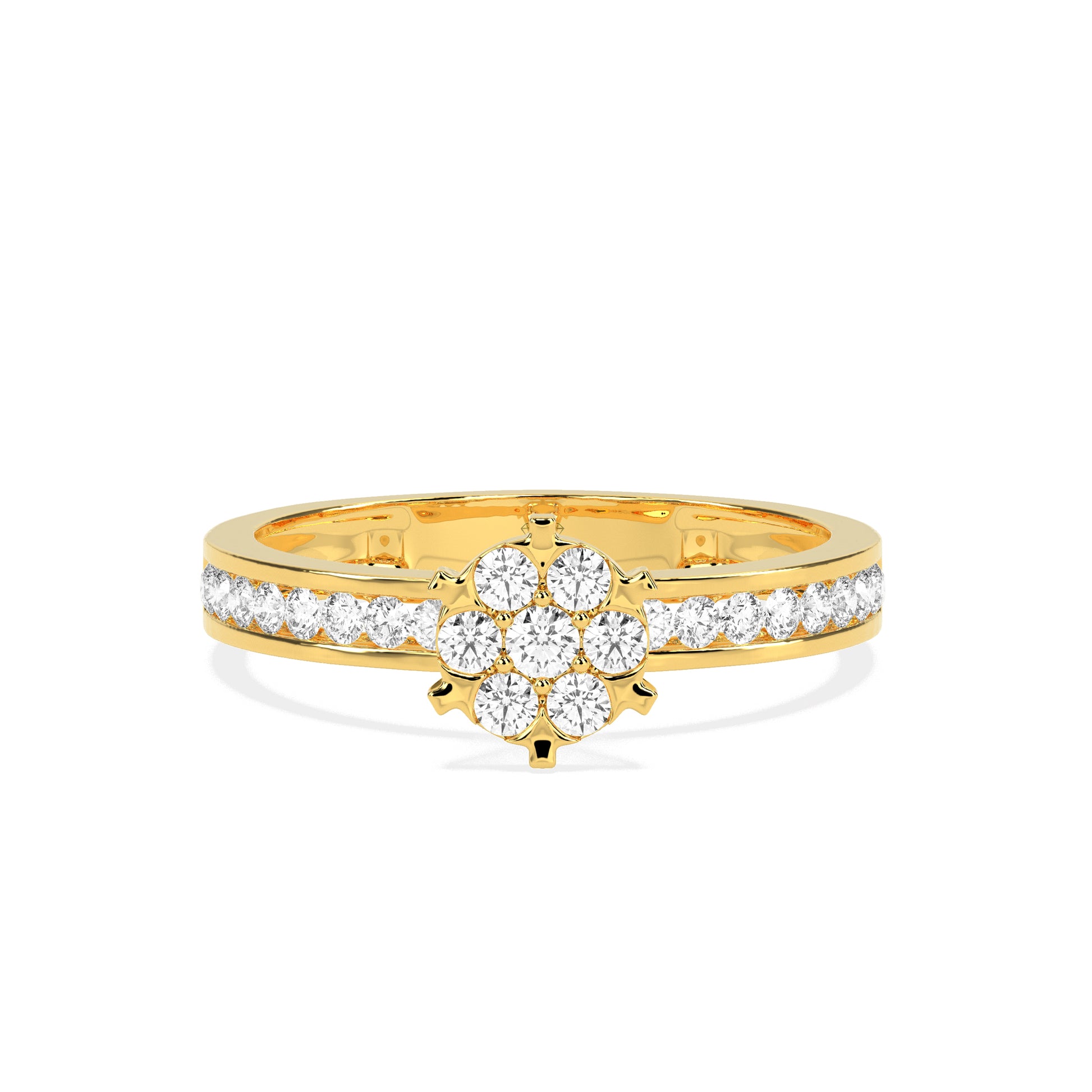 Beautifully crafted, this floral diamond cluster ring features a sparkling flower design made with brilliant round diamonds at the center. The diamond-studded band enhances the overall brilliance, giving the ring a delicate and luxurious appearance.